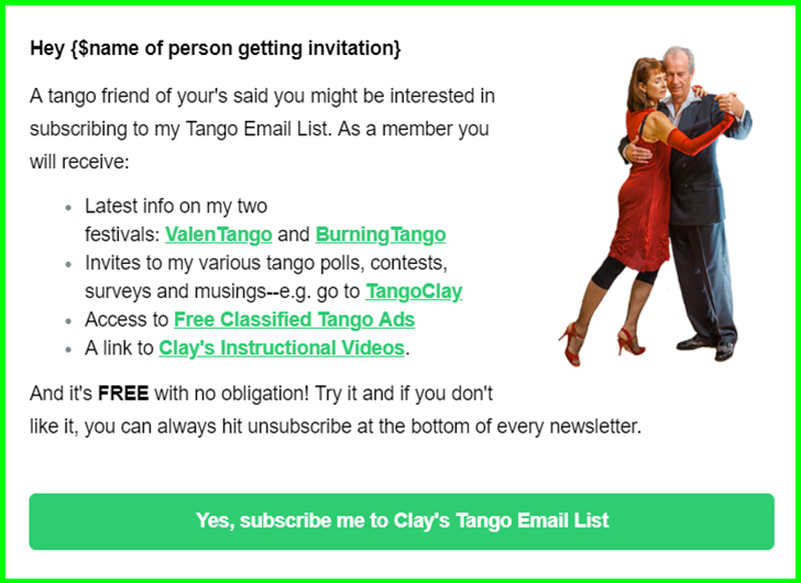 Thanks so much for providing the name and email of a tango friend who you think would enjoy and benefit from being on my Tango Email List. I’ve sent your friend a special invitation to opt into my list. (See example below.)